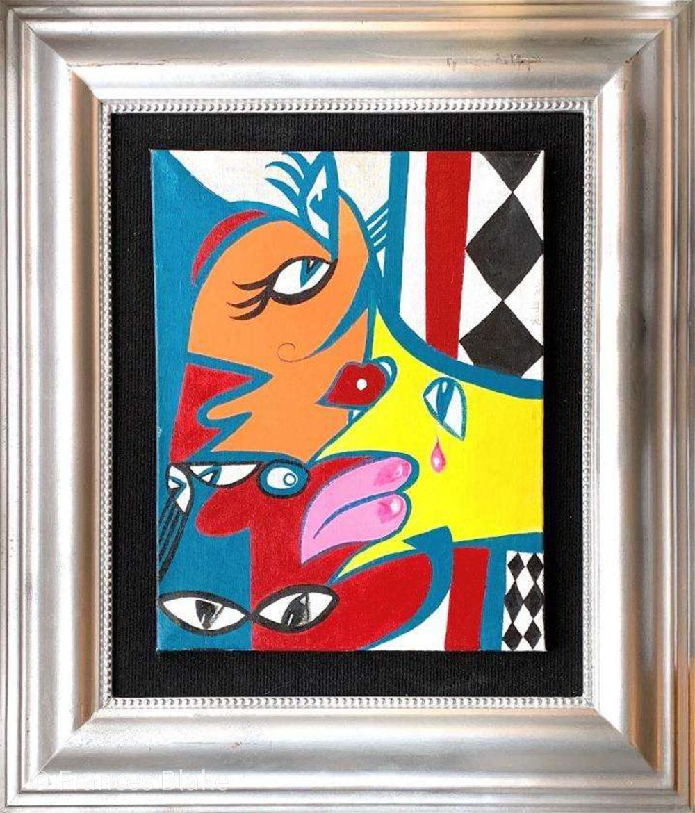 1,2,3,4 named as this was the way the faces were drawn in the painting.  This painting can be viewed upside down.  Makes for interesting discussions at the dinner table or let your imagination run wild in the early morning before getting up.  How many faces can you see, can you see the numbers? Painting is velcroed to the black bac ground so you don’t have actually take the painting off the wall to change the view!